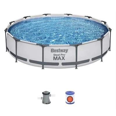 Stay cool all summer long with the Bestway Steel Pro Max 12-Foot x 30-Inch Round Above Ground Frame Pool and Flowclear Cover.This premium pool set comes with all the equipment you need to set up and maintain your pool, hassle-free, including a filter cartridge and pump. Easy to set up, the steel frame is durable, low-maintenance, and protected from rust. The heavy-duty PVC and polyester 3-ply side walls provide added longevity. When it comes time to empty the pool, the drain valve attaches to a garden hose so you can drain the water away from the pool and avoid flooding your lawn.Paired with a perfectly fitting pool cover made of durable PVC material, you’ll be able to keep your water pristine. Specially crafted to help keep leaves, sticks, and other debris out of your pool, and designed to fit perfectly on your new Steel Pro Max. Featuring drain holes that prevent excess water, and ropes to ensure a snug fit, you can ditch the stress and focus on making lasting memories with your loved ones.Enjoy endless summer fun with your family and friends using the Steel Pro Max Round Above Ground Pool and Flowclear Cover from Bestway.