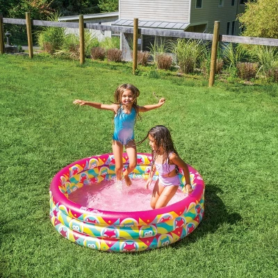 Take a dip in the BigMouth Squishmallows Lil’ Pool, featuring adorable Squishmallows characters. The inflatable kiddie pool features inflatable side bumpers for added safety and comfort while lounging, and is easy to inflate with a small speed valve on the bottom side of the mini pool. Can hold up to 4 people. 15″ deep when inflated.