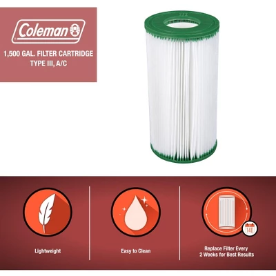 Give your Coleman swimming pool pump its best performance by using the Coleman Filter Cartridge Type III A/C.This filter cartridge sifts out the debris and dirt in your above-ground swimming pool so the pump can refill it with clean pool water. It’s recommended you replace your filter cartridge every few weeks to ensure your pool obtains the highest standard of cleanliness and hygiene. When you maintain your pool’s filter, the water in your pool stays attractive and fresh all summer long, which makes it all the more enjoyable for your family and friends.This replacement cartridge is compatible with all Coleman brand pools with 1,000 GPH and 1,500 GPH pool filter pumps (listed below). It’s also compatible with 1,000 and 1,500 GPH Bestway swimming pool filter pumps. Coleman Power Steel Round Frame Pools compatible with Coleman Filter Cartridge: Part number 90337 (14 feet x 42 inches) 90321 (16 feet x 48 inches) 90323 (18 feet x 48 inches) 90331 & 13889 (22 feet x 52 inches) 90338 (26 feet x 52 inches) 90335 (18 feet x 9 feet x 48 inches)