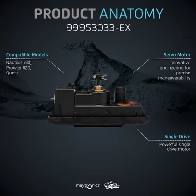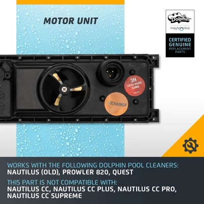 Introducing the Maytronics part number 99953033-EX, a replacement motor unit designed for specific Dolphin Robotic Pool Cleaners, including the Nautilus, Prowler 820, and Quest models. This motor unit is a certified genuine part from Maytronics, ensuring high quality and compatibility with your Dolphin Robotic Pool Cleaner.The 99953033-EX motor unit is a reliable solution for maintaining the performance of your Dolphin Robotic Pool Cleaner. When your existing motor requires replacement, this unit provides a perfect fit and functionality, allowing your pool cleaner to continue operating at its best.Maytronics is a trusted brand in the pool industry, known for its commitment to producing genuine and durable parts. By choosing the Maytronics Certified Genuine Parts, you can be confident in the quality and longevity of the replacement motor unit.