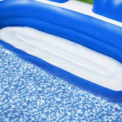 Enjoy summertime fun with the family when you add the H2OGO! Splash Paradise Inflatable Family Swimming Pool to your backyard festivities this season. Measuring over 7 feet wide by 31 inches tall the pool is ideal for splashing about safely and comfortably. With fortified walls featuring 3 equal-sized rings and extra-wide sidewalls, this splash pool is stable and durable for seasons to come. The bright blue walls, white accents, and realistic-looking mosaic print floor add a beautiful and exciting touch to your backyard. While the kiddos splash away you can comfortably sit on the submerged bench seat and rest your head on the built-in headrests as you watch them swim around in excitement. Relish in the summer sun and stay refreshed and hydrated thanks to the included cupholders that securely hold your beverage for safekeeping. Once the summer season is over you can easily drain the pool with the easy-to-use drain valve and store the pool away until the warmer months. Disclaimer: Blower motor not included.Soak up the sun, splash away, and stay refreshed all summer long in the H2OGO! Splash Paradise Inflatable Family Swimming Pool.