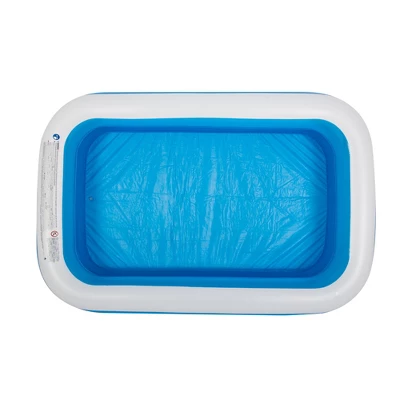 Good times are here with this spacious, fun, inflatable pool that is big enough for the whole family to enjoy. The comfortable, wide sidewalls allow for ultimate lounging to make your summer experience unforgettable. This will become a quick, backyard favorite all summer long.Product Features: Royal blue and white inflatable swimming poolThis pool has a sturdy 2-ring constructionMade with heavy-duty vinylThe pool is rectangle in shapeSuitable for ages 6 and upDimensions: 8.5 feet long x 5.75 foot wideDepth: 20 inchesMaterial(s): vinyl